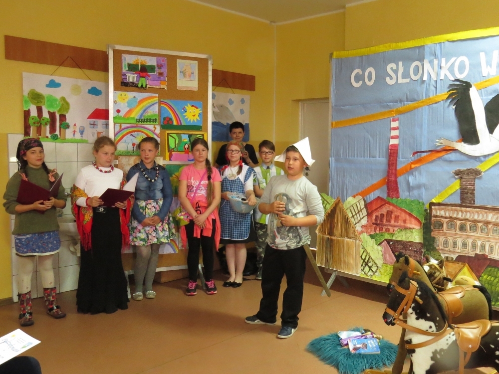 Uczniowie z klasy 5 c przedstawili zebranym scenkę pt. „Co słonko widziało, gdy nad Miejską Górką się zatrzymało”, opartą na utworach Marii Konopnickiej.