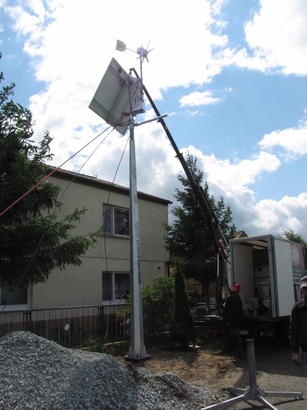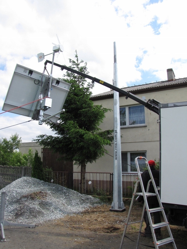 Trwa montaż lamp solarno-wiatrowych, służących do zasilania oświetlenia drogowego. Do tej pory w wyznaczonych miejscach na terenie gminy Miejska Górka zamontowano słupy wraz z instalacjami solarnymi i siłowniami wiatrowymi oraz dwie oprawy oświetleniowe, w celu sprawdzenia ich oprogramowania oraz zdalnego sterowania.