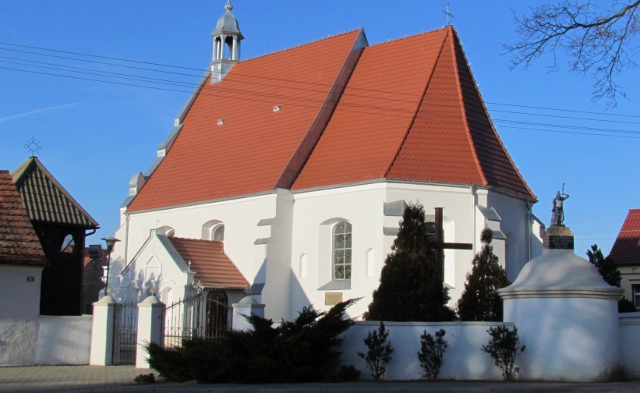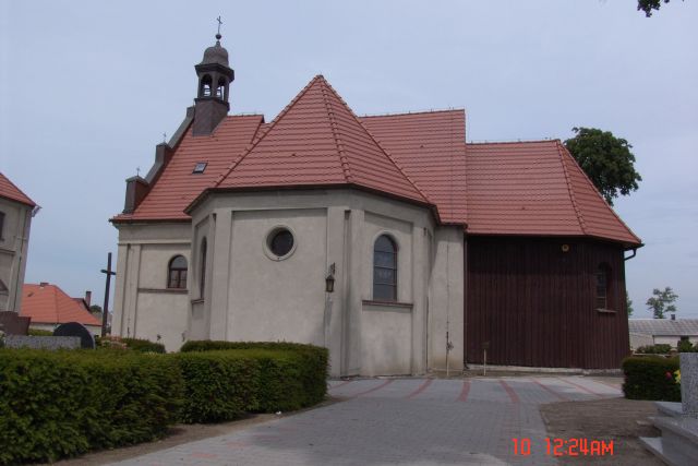 Fundatorem kościoła był ród Adwańców – Kołaczkowskich. Obecną świątynię wzniesiono w 1901 roku na miejscu drewnianego kościółka. Konsekrował ją bp Edward Likowski w 1907 roku. We wnętrzu kościoła odnajdujemy ślady twórczości Antoniego Procajłowicza, który był autorem polichromii i Drogi Krzyżowej. Niestety, te dzieła sztuki ucierpiały podczas II wojny światowej, kiedy to kościół zamieniono na magazyn środków chemicznych. Cześć figur, m.in. Chrystusa, Maryi, ewangelistów i świętych odrestaurowano w latach 70 XX w. W ołtarzu głównym znajduje się obraz Madonny z dzieciątkiem i kopia wizerunku jasnogórskiego pochodzenia z początków XVII w. Na szczególną uwagę zasługuje ołtarz główny, stylowa drewniana ambona i witraże.